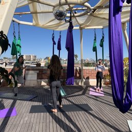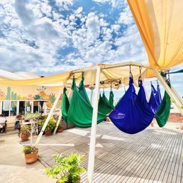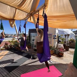 first time at the studio, and i took a morning aerial level 1 yoga class with leila through class pass. this class was on the rooftop with beautiful views and some shade provided by the silks hanging above. it also happened to be a heat wave day in san diego, and the sun was coming in east, so leila helped set up some umbrellas for more shade. she was very sweet in welcoming and introducing me and some other first timers to aerial yoga, and overall guided us all very well through the practice with encouragement, softness, and also challenges. the others in the class were also super sweet and even helped spot when doing moves i've never done before. would definitely love to come back and try other classes in the beautiful space, through classpass or their own membership plans! the food i didn't get to try, definitely on the pricier side but aligns with the super health and wellness place that it is, but might want to try a treat the next time i'm back.
